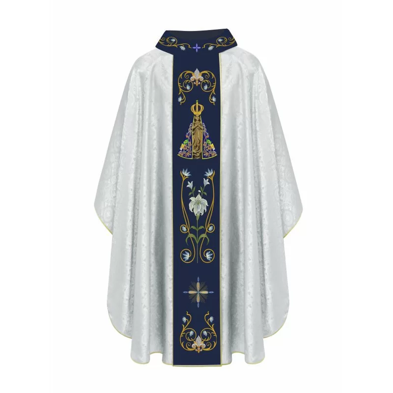 Casula Nossa Senhora Aparecida tecido brocado com Pedras, Gola e Galão em Veludo.